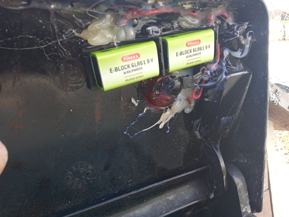 rakennettu rajakytkin ja se kytkee 2x 9V paristoa painikeosan pariston